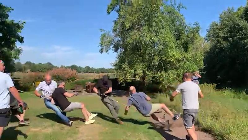 Leider konnte das zweifach geknotete Seil diese Kraftentfaltung nicht Stand halten, das Seil riss und die Schützenbrüder gingen zu Boden. Zum Glück gab es nur leichte Abschürfungen und Prellungen, so dass beim nächsten Versuch mit einem neuen Seil, alle Schützenbrüder wieder am Seil standen konnten.